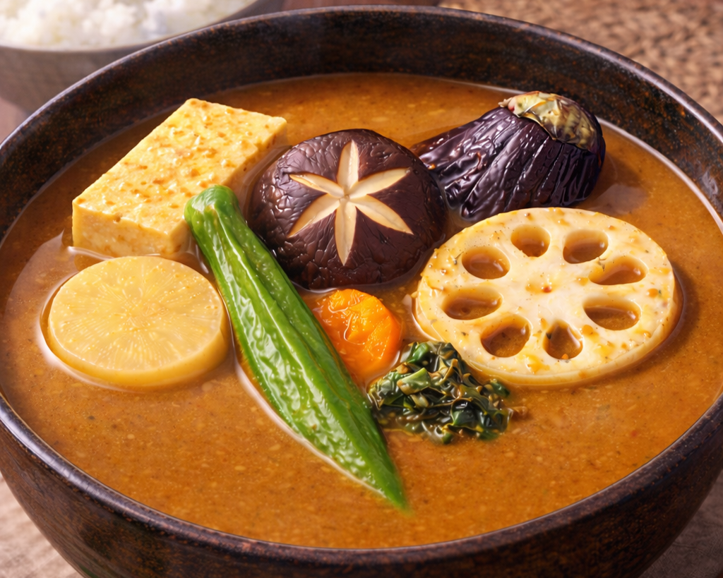 Soup curry originated in Sapporo, Hokkaido, in the 1970s as a spice-forward alternative to traditional Japanese curry. Shaped by Hokkaido’s cold climate and an emerging spice culture, it was designed to be deeply warming yet light and aromatic.